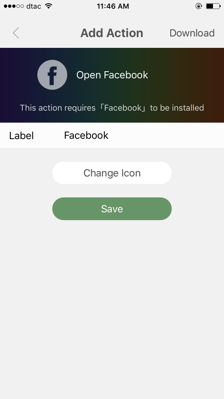 ตัวอย่างการใช้งานเพิ่มปุ่มลัดแอป Facebook ให้เข้าที่ตัวแอป AirLaunch Pro กด ‘+’ > เข้า Launch App > เลือกแอป Facebook > ตั้งชื่อตามที่ต้องการ กด Save