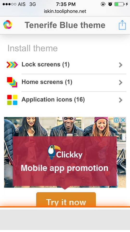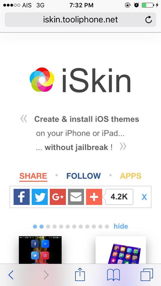 ให้เข้าไปที่ Safari แล้วพิมพ์ที่ URL ว่า http://iskin.tooliphone.net/