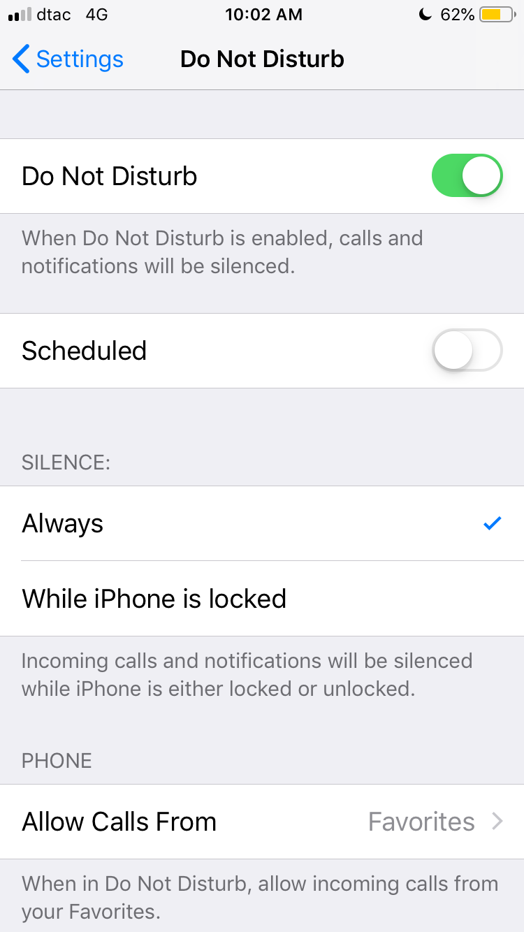 อันดับแรกให้เข้าไปที่แอป Settings > Do Not Disturb เลือกเปิด Do Not Disturb แล้วลงมาที่หมวดที่สาม Silence เลือกเป็น Always เพื่อปิดการแจ้งเตือนทุกรูปแบบไม่ว่าจะอยู่ที่หน้า Lock Screen หรืออยู่ที่หน้า Home Screen ก็ตาม
