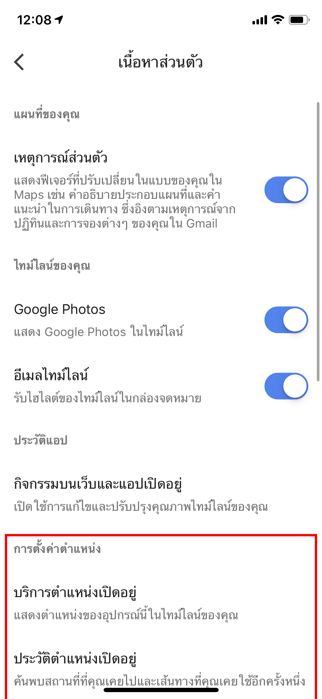 ขั้นตอนที่ 5: เปิด “บริการตำแหน่ง” และ “ประวัติตำแหน่ง” (กรณีปิดอยู่)