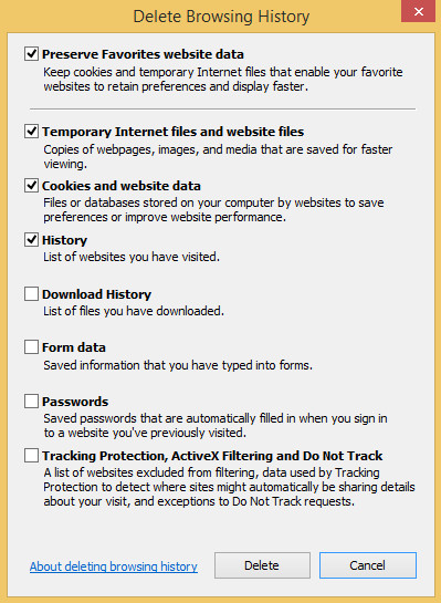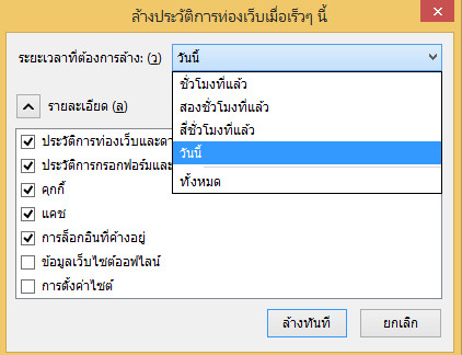 เข้าไปที่มุมขวาบน (เหมือน Firefox และ Chrome) แล้วเลือกไปที่ Internet Options > ไปที่หัวข้อ Browsing History แล้วเลือก Delete… จากนั้นให้ติ๊คถูกตามภาพ (เป็น Default) แล้วกด Delete ก็เป็นอันสำเร็จ