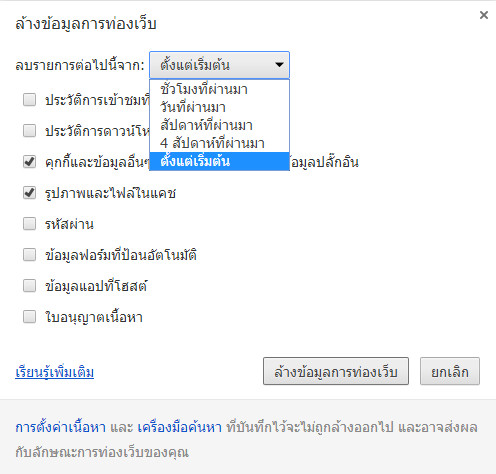 คู่หูอีกคนของผู้ใช้งานอินเทอร์เน็ตทั้งบน PC และ Mobile ที่เด่นในด้านความเร็วสูง (และกินแรมสู๊งสูง) มีวิธีล้างแคชไฟล์ที่ง่ายกว่า Firefox พอสมควรคือ กดเข้าไปที่มุมขวาบนของจอ > เครื่องมือเพิ่มเติม > ล้างข้อมูลการท่องเว็บ… แล้วก็เลือกติ๊กตามภาพ ก็จะทำการล้างไฟล์แคชของ Chrome ออกได้แบบหมดจรด โดยไม่กระทบกับ Password ที่เราจำไว้ในเครื่องแต่อย่างใด