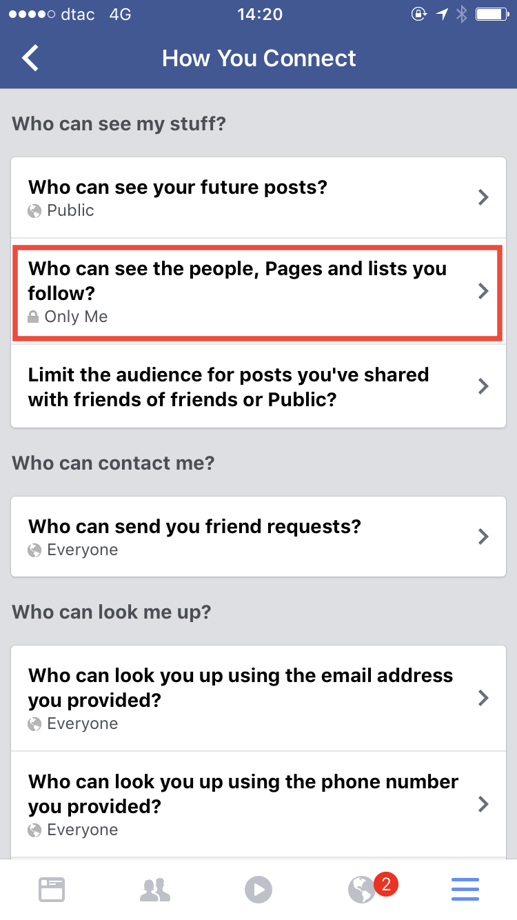 3. ดูในส่วนของ Following (กำลังติดตาม) แล้วเปลี่ยนจาก Friends เป็น Only Me (เฉพาะฉัน)