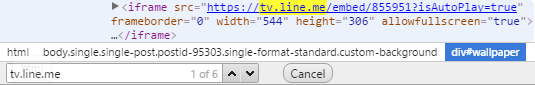 Step 5: ค้นหาโค้ดในแถบ Elements โดยกดที่โค้ดและกด Ctrl+F และค้นหาคำว่า “tv.line.me” ผลการค้นหาก็จะเป็นลิงค์ “https://tv.line.me/embed/xxxxxx?isAutoPlay=true” ก็ให้คลิกขวาที่ลิงค์และทำการเปิดในแท็บใหม่