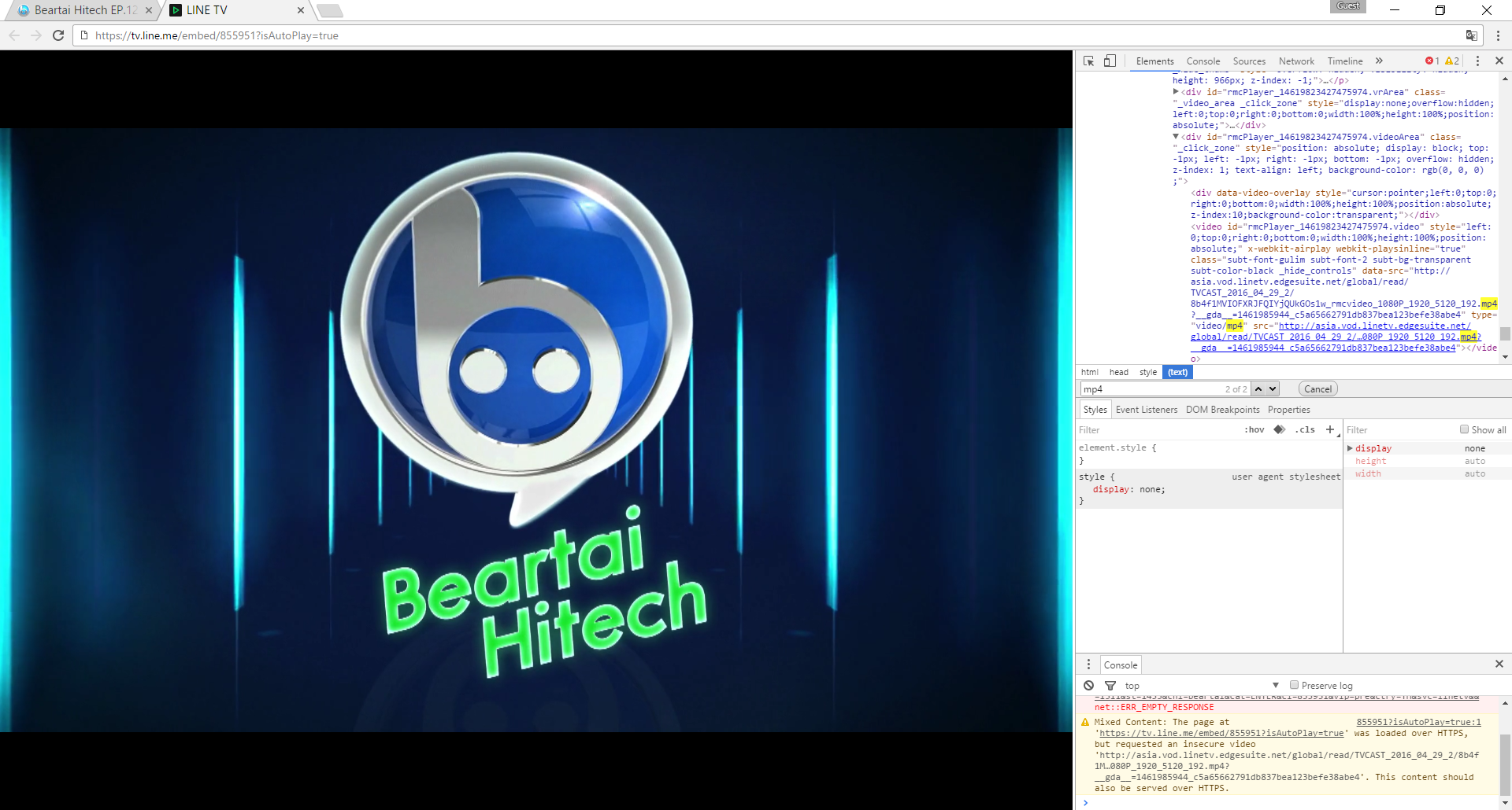 Step 7: ให้ทำคล้ายๆกับ Step 4 และ Step 5 เพียงแค่เปลี่ยนการค้นหาเป็นคำว่า “mp4” จากนั้นก็เลื่อนการค้นหาให้เจอลิงค์คล้ายๆ http://asia.vod.linetv.edgesuite.net/global/read/****/****.mp4?gda=1461983418_739abcb35365175d37b3ad6ba56e81d4 จะเห็นว่ามีนามสกุลไฟล์ MP4 และมีโค้ดต่อข้างท้ายก็ต้องนำมาด้วย