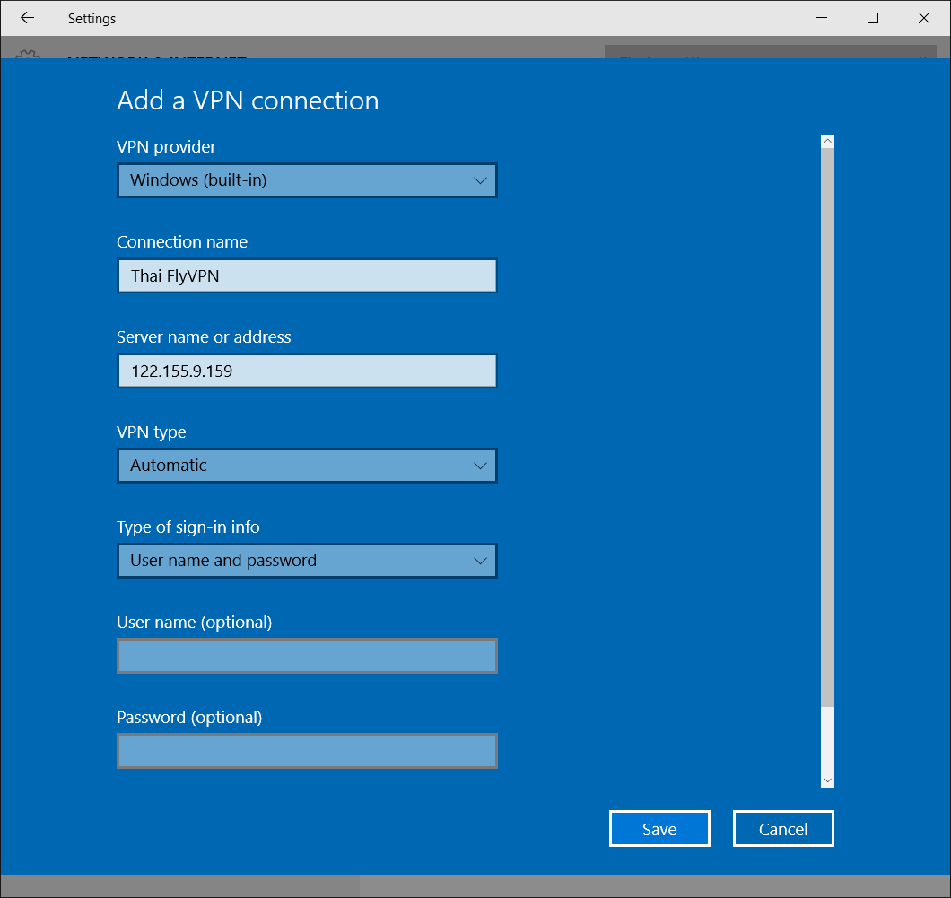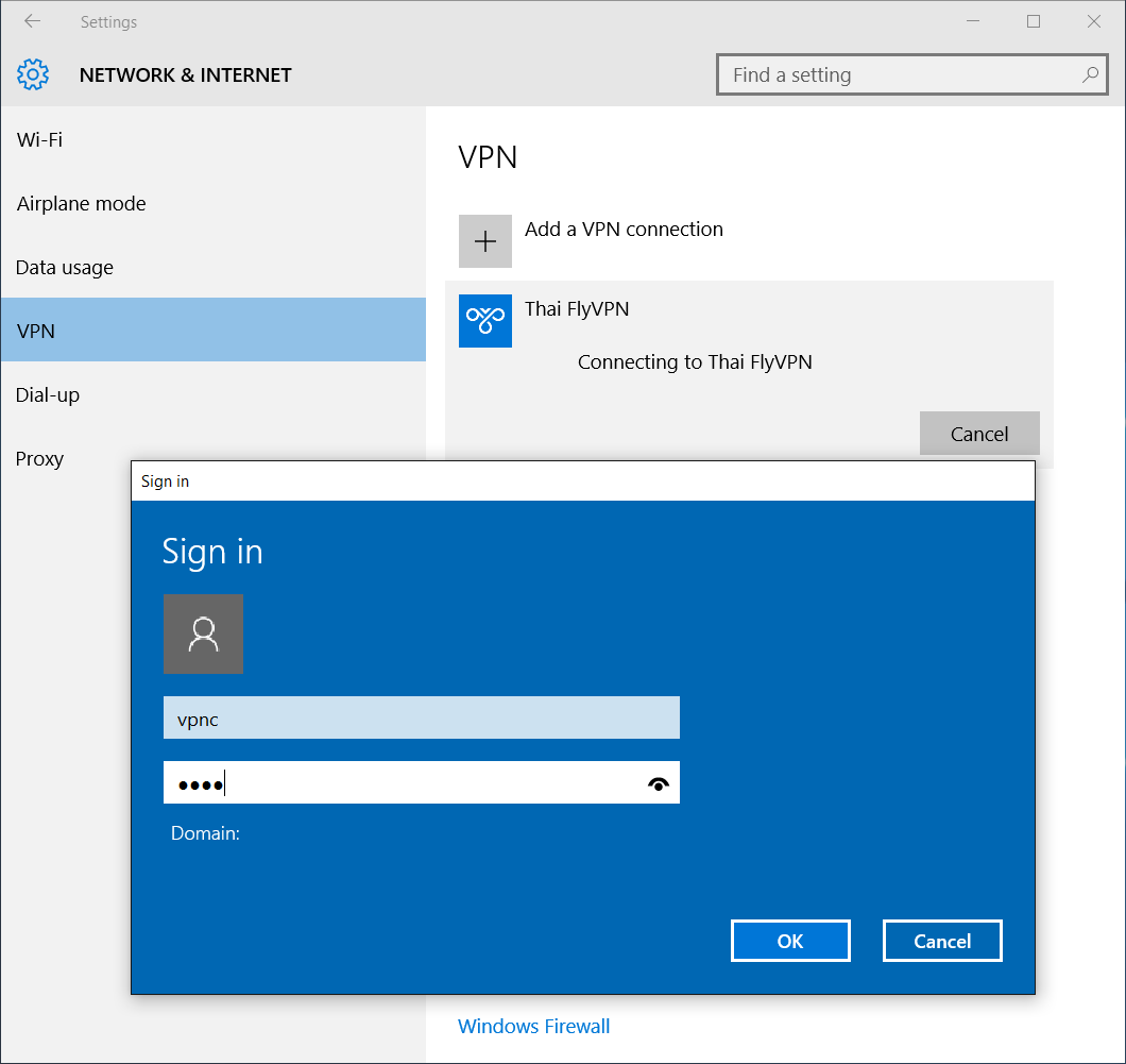 Step 2: ลงชื่อเข้าใช้ VPN สามารถเลือกชื่อผู้ใช้ใส่ได้ทั้ง vpnu และ vpnc ในไอพีเซิร์ฟเวอร์ 122.155.9.159 สามารถรับรหัสทดลองได้ที่ www.flyvpn.com/freetrial