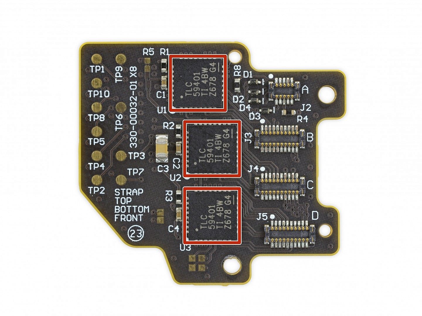 ซึ่งบอร์ด LED drivers นี้จะต่างจากบอร์ด STMicroelectronics LED drivers ที่พบใน Development Kit 2 และมี TI TLC59401 16-Channel LED Driver with Dot Correction and Grayscale PWM Control ถึง 3 ตัว