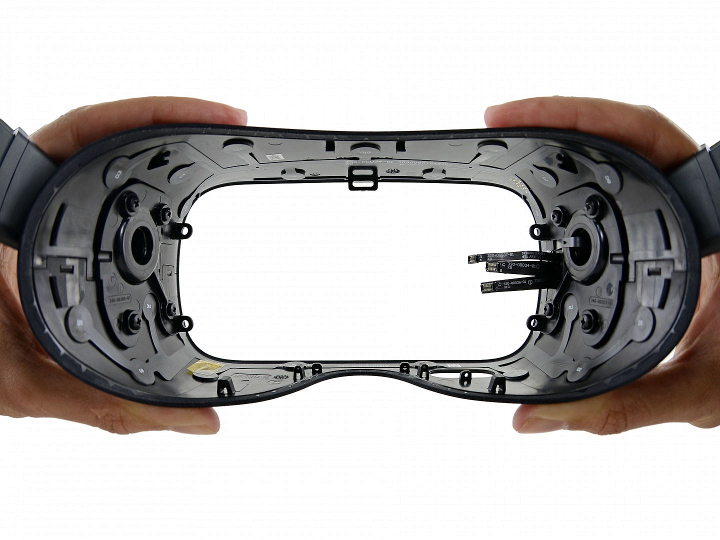 เมื่อถอดกรอบออกมาก็จะได้เห็นกับแผงวงจรมากมายที่อยู่ภายในตัวแว่น โดยด้านบนของแว่นนั้นจะมีแผงวงจรเมนบอร์ดอยู่ซึ่งมีชิปอยู่หลายตัว ดังนี้