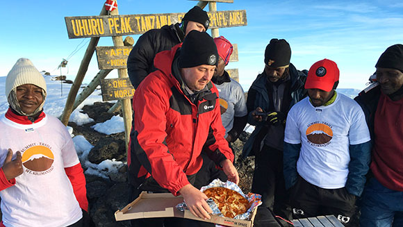 การเดินทางของพิซซ่าในครั้งนี้ยาวไกลมาก พิซซ่านั้นทำที่ดาร์เอสซาลามในประเทศแทนซาเนีย จากนั้นก็เริ่มการเดินทางด้วยเครื่องบิน ต่อด้วยรถยนต์ และกระเป้าเป้สะพายสำหรับใส่พิซซ่าที่มีแบตเตอรี่เพื่อเก็บความร้อน ซึ่งเมื่อของไปถึงบนยอดนั้นก็ยังอุ่น ๆ อยู่